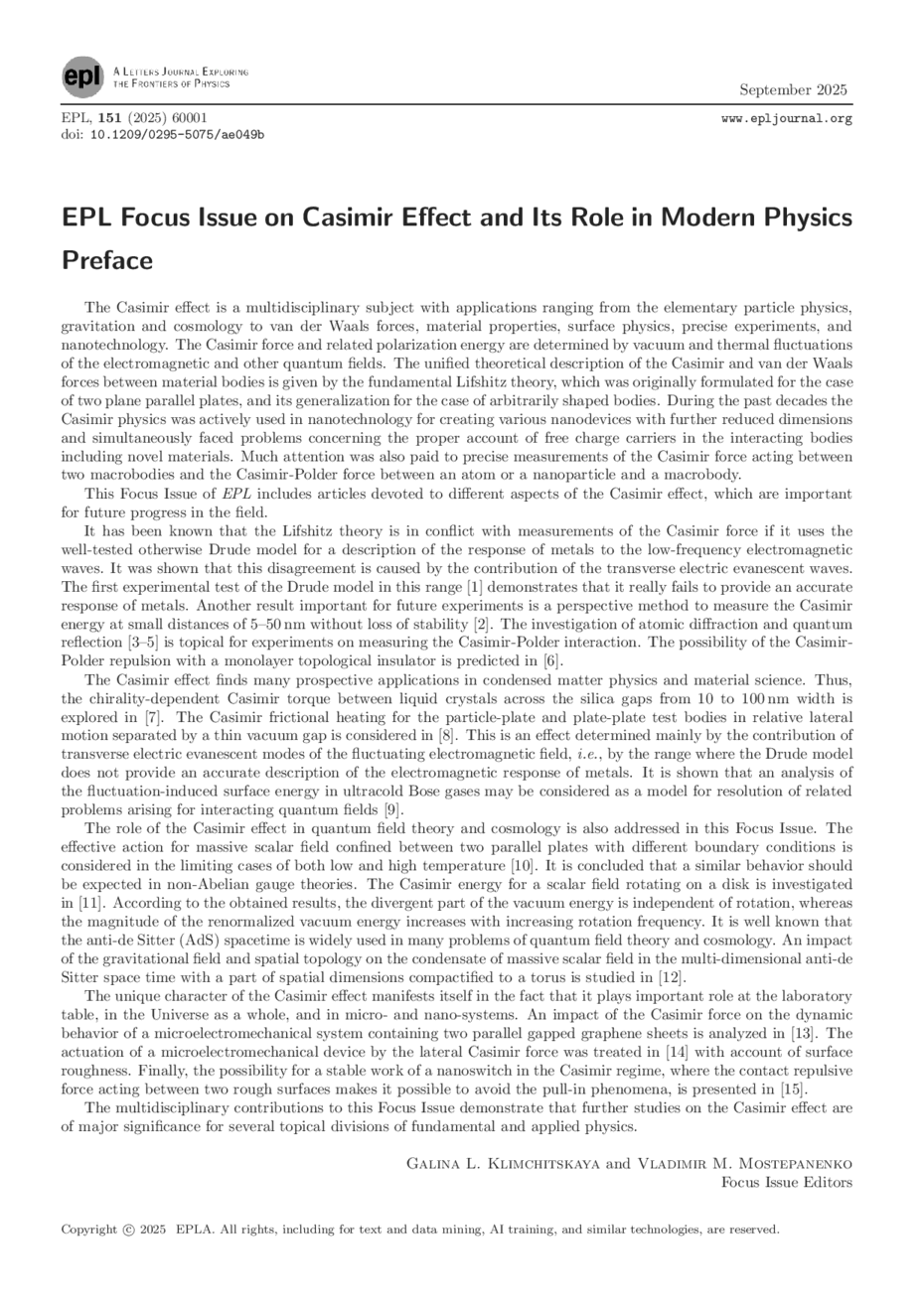 EPL Focus Issue on Casimir Effect and Its Role in Modern Physics Preface