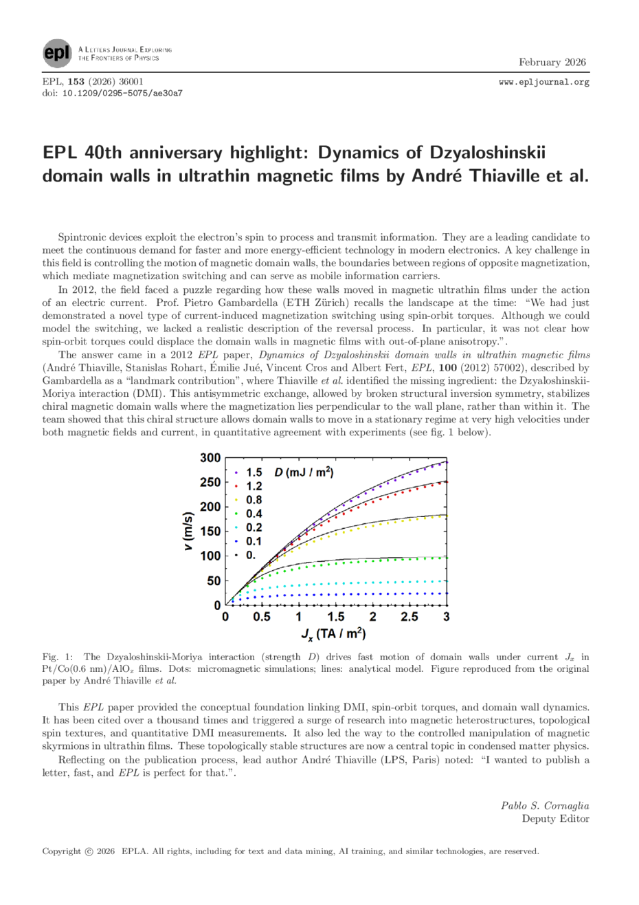 EPL 40th anniversary highlight: Dynamics of Dzyaloshinskii domain walls in ultrathin magnetic films by André Thiaville et al.